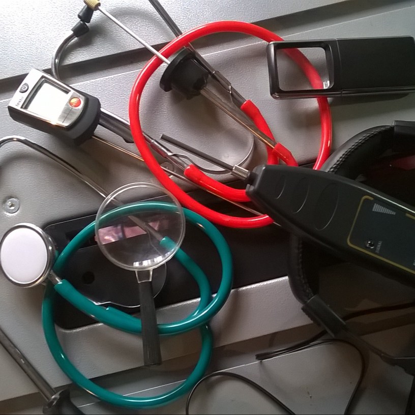 - Visual inspection of the gears whether damage is present, there is sufficient lubricant. Listen to the running gears. Defective or poorly adjusted gears produce dull noises and noticeable vibrations. This is where a stethoscope helps.